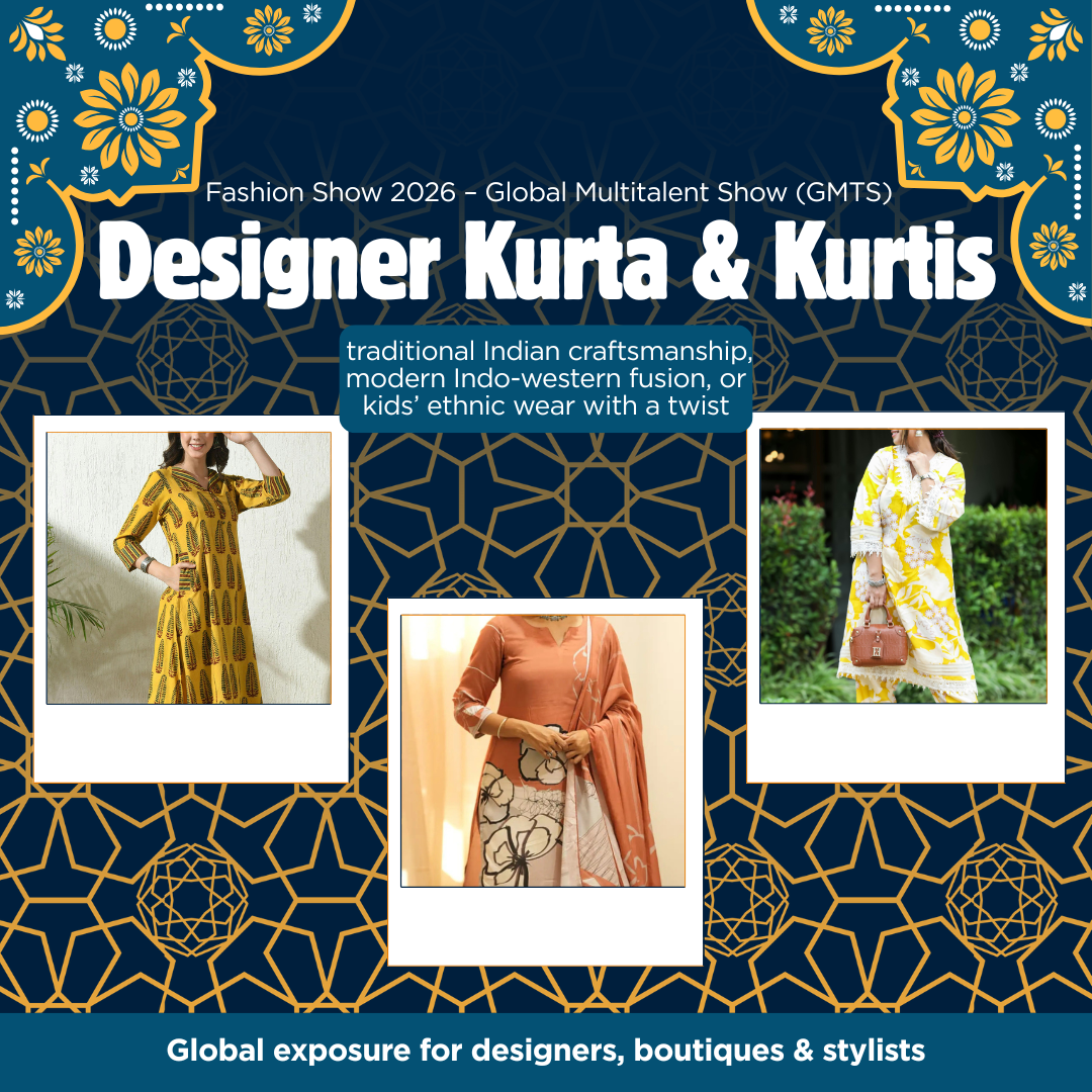 Join the Designer Kurta & Kurtis Fashion Show 2026 by GMTS — global runway for ethnic and fusion wear for all ages. Designer Kurta & Kurtis Fashion Show 2026 – Global Multitalent Show (GMTS) Designer Kurta & Kurtis Fashion Show 2026 – Global Multitalent Show (GMTS)